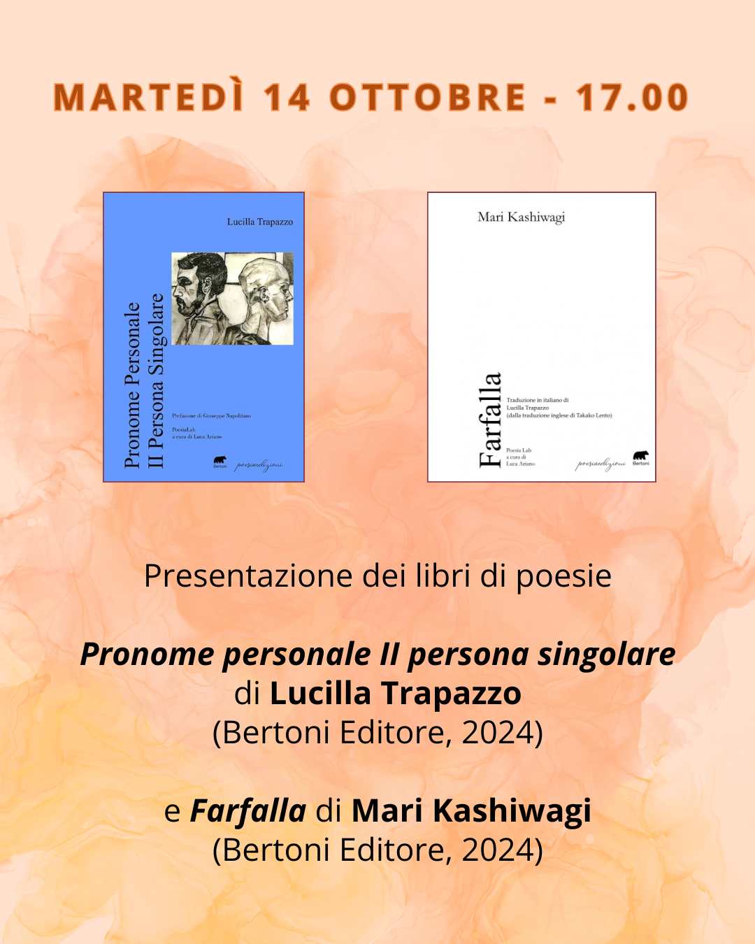 In occasione del secondo incontro, martedì 14 ottobre alle ore 17, verranno presentati i libri di poesie Pronome personale II persona singolare di Lucilla Trapazzo e Farfalla di Mari Kashiwagi.